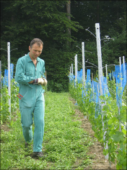 Beim Erlesen (Läublen) werden überschüssige Schosse entfernt, sowie überall das hinterste Blatt entfernt. Später folgt das Einschlaufen: Sobald die Schosse zum ersten Draht reichen, werden sie immer wieder «eingefädelt» bis sie über den obersten Draht reichen…