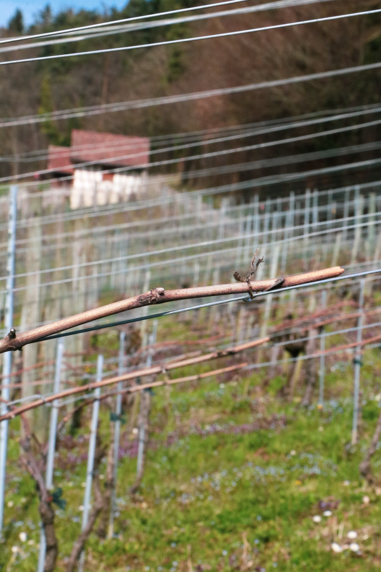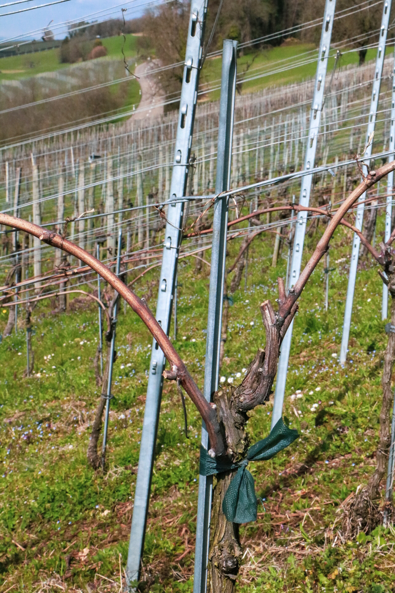 Das geschnittene Rebholz wurde in der Zwischenzeit gemulcht und fördert so den Humusaufbau und beugt Erosion vor. Die Streckschosse werden mit Bindedraht an die Rebanlage gebunden. Das gibt der Rebe halt. Da sich nun alle Triebe auf der gleichen Höhe befinden, werden die späteren Rebarbeiten einfacher ausgeführt werden können.