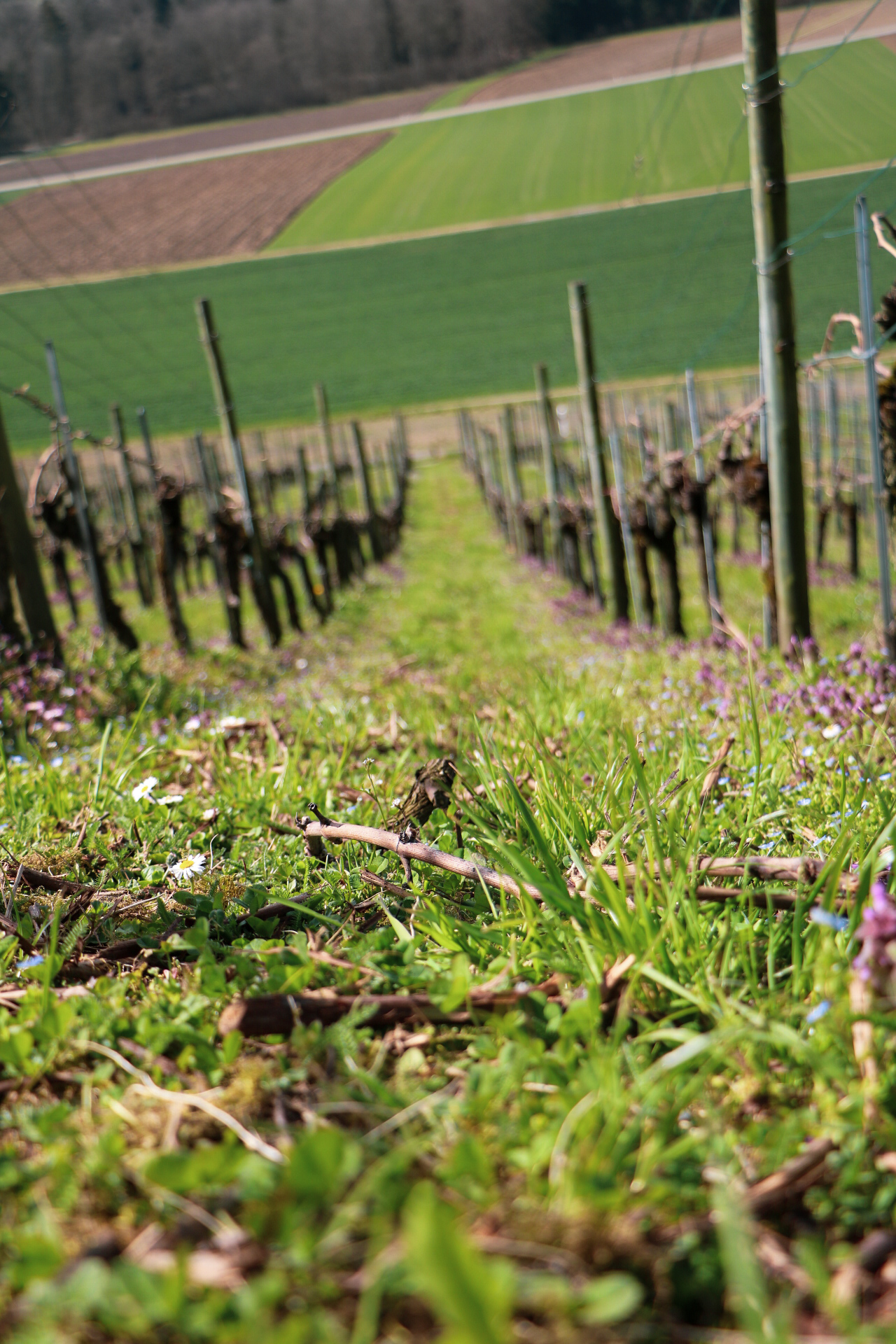 Zwischen den Reihen wird eine Grasmischung eingesäht, um die Rebanlage vor einer allfälligen Erosion zu schützen.